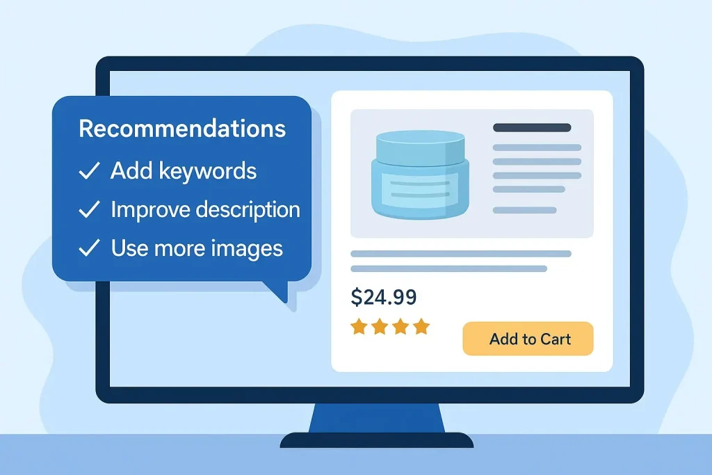 - Generating Prioritized Recommendations: Instead of showing you a dashboard, your PXM Copilot delivers clear, actionable suggestions. It will tell you precisely which keywords to add to your title, what kind of images you’re missing to compete with the leaders, and what phrases to highlight in your description.
